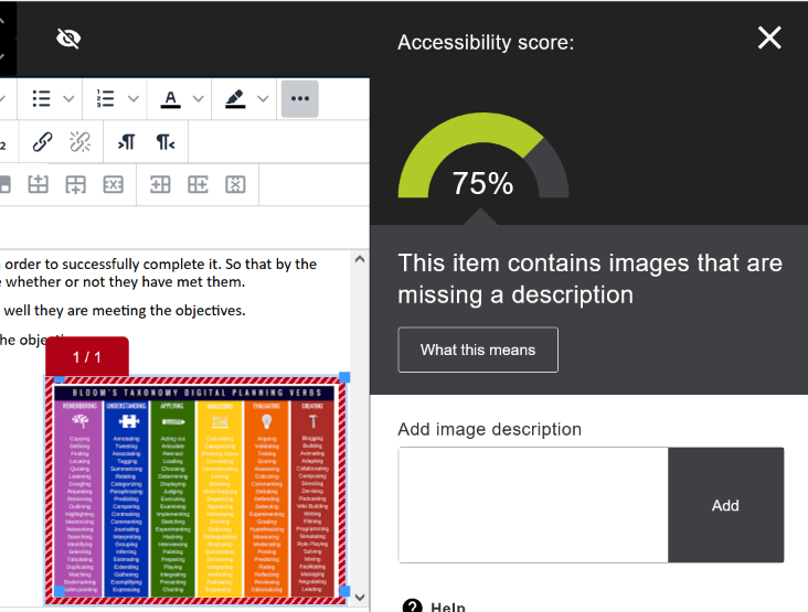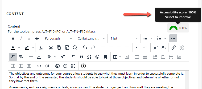 - Use the Accessibility Checker in Blackboard to check your course materials - The Accessibility Checker is the half circle in the upper right hand corner. It ranges in color from red to green, indicating the level of accessibility. This is a great last step before saving your pages in Blackboard.