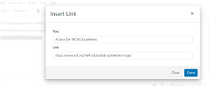 - Create descriptive links and open external links in a new window - The text of your links should tell your students where they are going. In the screenshot below, the "Text to display" field is where you should add descriptive text for users.