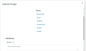 )and then "Upload Image". When you add the image, you have the option right there to add the Alt-text description. Below the image you'll see the Attributes settings where you can add the description.