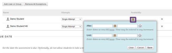 - Under Availability, select the date and time that the you have agreed to make the exam available to the student. Be sure to leave Force Completion unchecked and click Save.