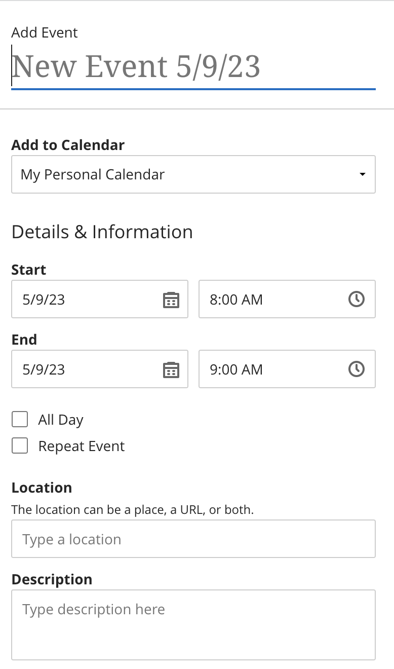 - Under Location, you can add your Zoom meeting link. If you are using Zoom or Collaborate for weekly chats, and these are linked in your course, you might just want to add here "link to the weekly chat can be found in the course".