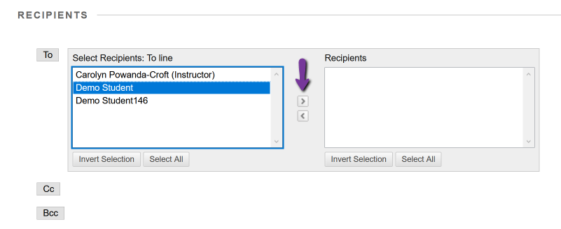 3. Click on To to view the recipients in the course. Highlight the name or names in the left-hand column and click the top arrow to move the name to the Recipient column.