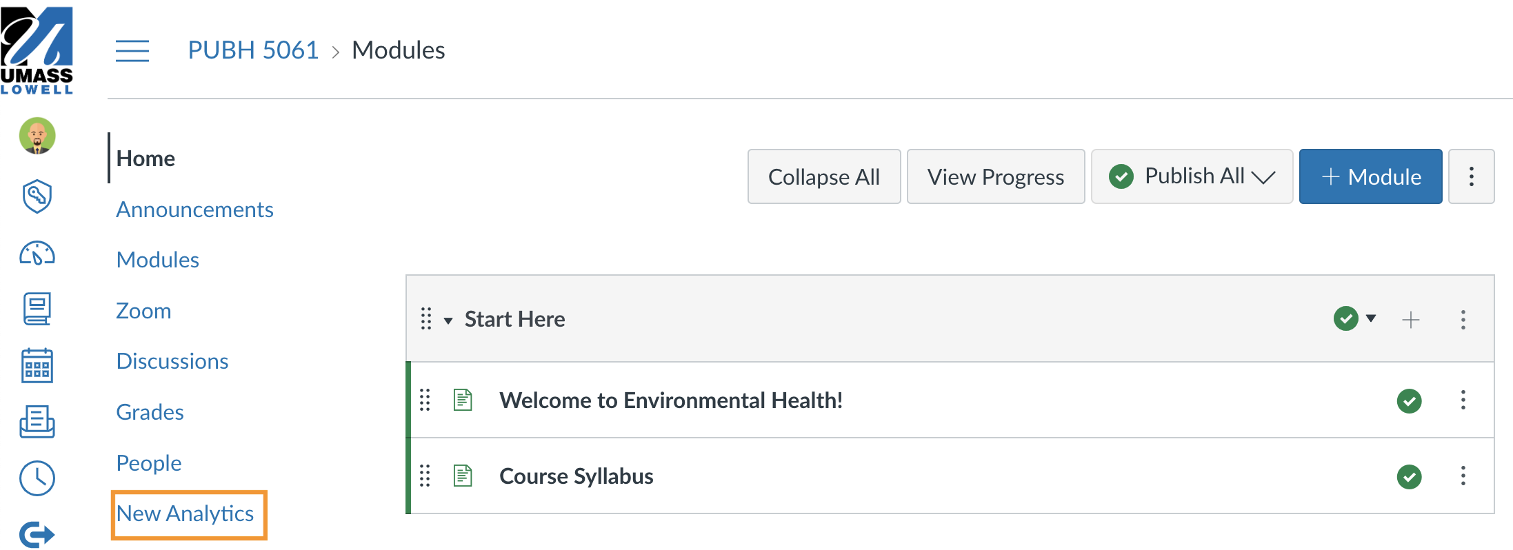 Instructors can use the tool New Analytics to view student analytics. New Analytics provides interactive graphs and tables that allow instructors to track a range of data.