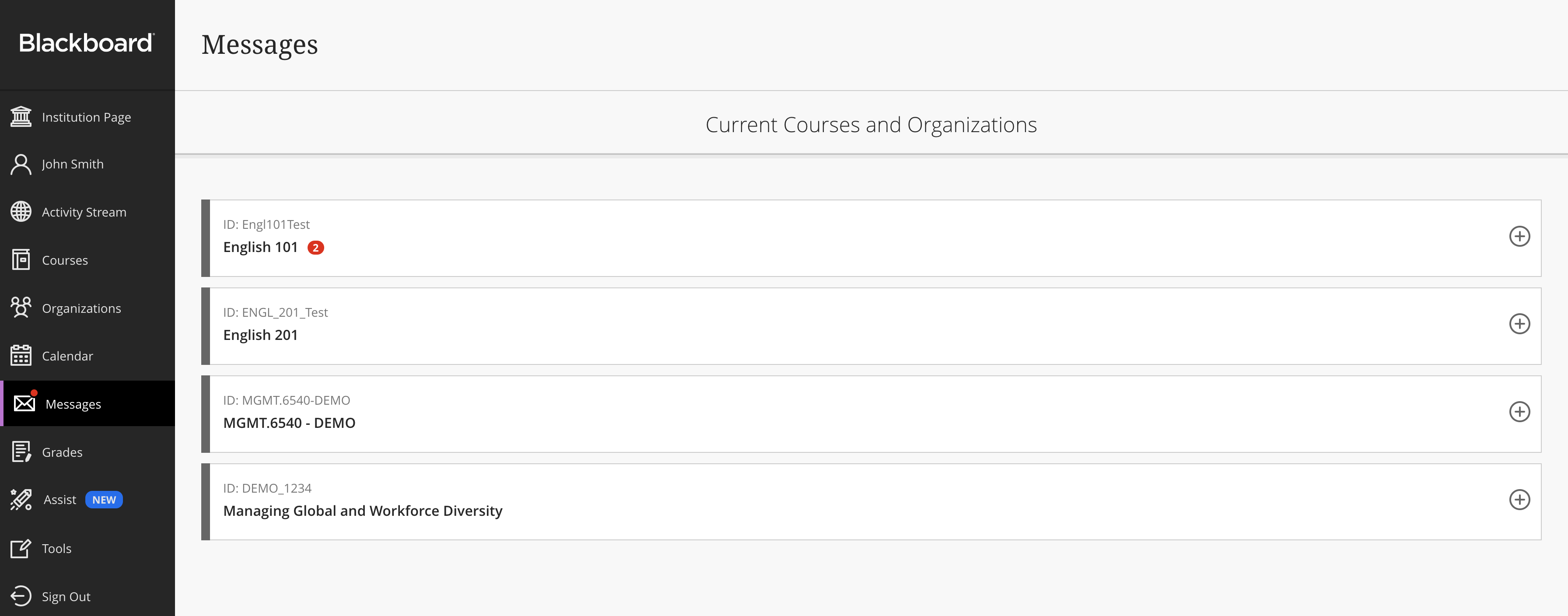 Blackboard's Messages tool is the same as the Mail tool you may use in your course. Messages may be accessed through the link on your Base Navigation menu, or you can access your course Mail by entering your course and choosing Mail in the left-hand menu.